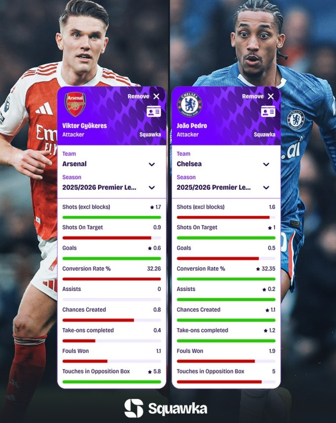 零点吧足球2月27日讯 下一轮英超将迎来焦点战阿森纳对阵切尔西,数据网站Squawka也对比了两队前锋约克雷斯、若昂·佩德罗本赛季英超数据对比(每90分钟数据):