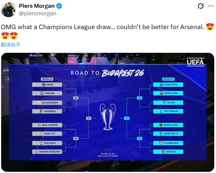 这样的抽签结果也让英国名嘴、知名阿森纳球迷皮尔斯·摩根喜笑颜开,在社媒发文庆祝:“天哪,这个欧冠抽签的结果……对阿森纳再好不过了??????”