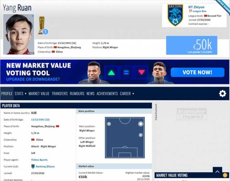 零点吧足球2月27日讯 2025赛季结束后,阮杨结束与天津津门虎的合约,随即离开球队。“德国转会市场”网站信息显示,阮杨已经加入中甲球队南通支云。