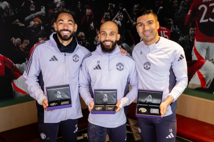 零点吧足球2月28日讯 曼联官方晒出卡塞米罗、库尼亚、姆伯莫三人合照,赠送纪念奖牌,纪念三人在英超的里程碑时刻。