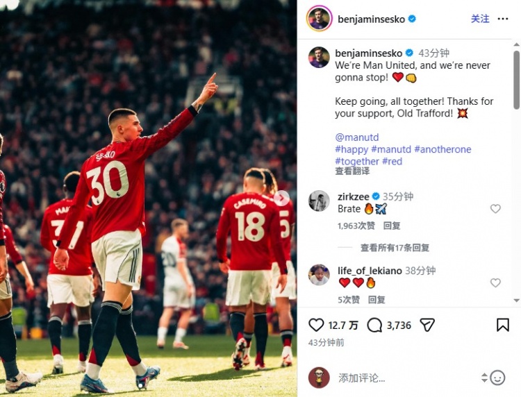 舍什科写道:“我们是曼联,我们永远不会止步!继续前进,团结一致!感谢老特拉福德球迷们的支持!”