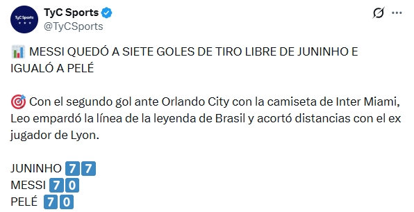 标准不同?TYC报道梅西任意球数追平贝利,ESPN统计梅西第4无贝利
