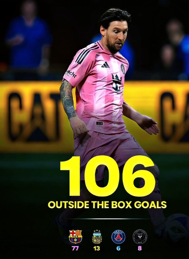 据统计梅西生涯已经打进了106记禁区外的进球(巴萨77球、阿根廷13球、巴黎6球、迈阿密国际8球),梅西平均10.7场比赛收获1个禁区外进球。