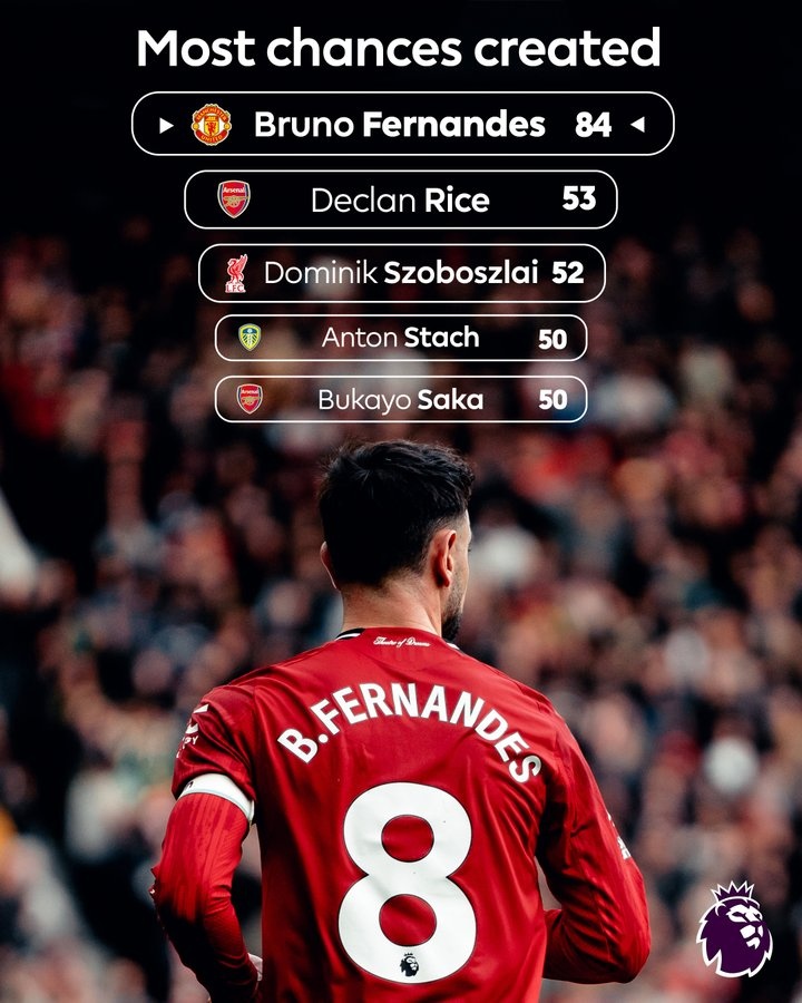 零点吧足球3月2日讯 英超官方晒本赛季联赛球员创造机会次数榜,B费84次遥遥领先,第二赖斯53次。