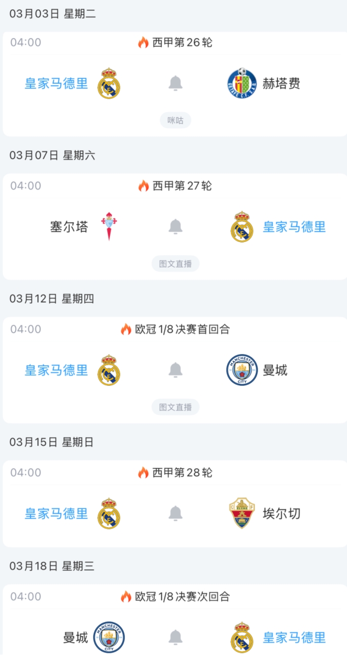 皇马后续赛程: