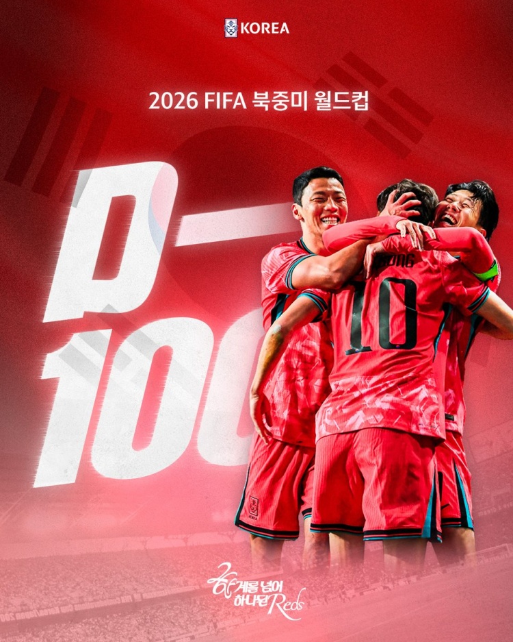 韩国足协官方社媒晒出倒计时海报,配文:“2026年世界杯倒计时100天。100天后韩国足球将再度点燃全球激情,超越极限,团结一心。”