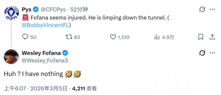 此役韦斯利·福法纳为切尔西首发出战,有媒体称这位切尔西后卫看起来受伤了,走进球员通道时一瘸一拐,但福法纳社媒辟谣,他表示:“嗯?我没事。”