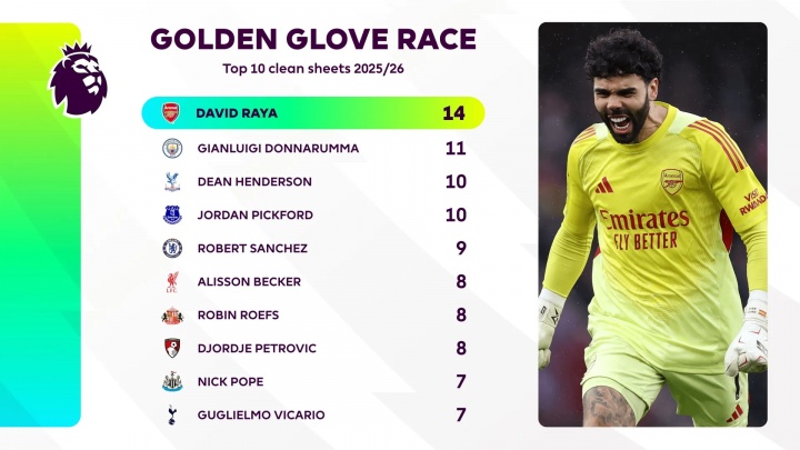 零点吧足球03月05日讯 本轮英超阿森纳客场1-0小胜布莱顿,拉亚再度收获零封,在金手套奖之争中继续扩大自己的领先优势,他正在力争连续第三次获得英超金手套奖。