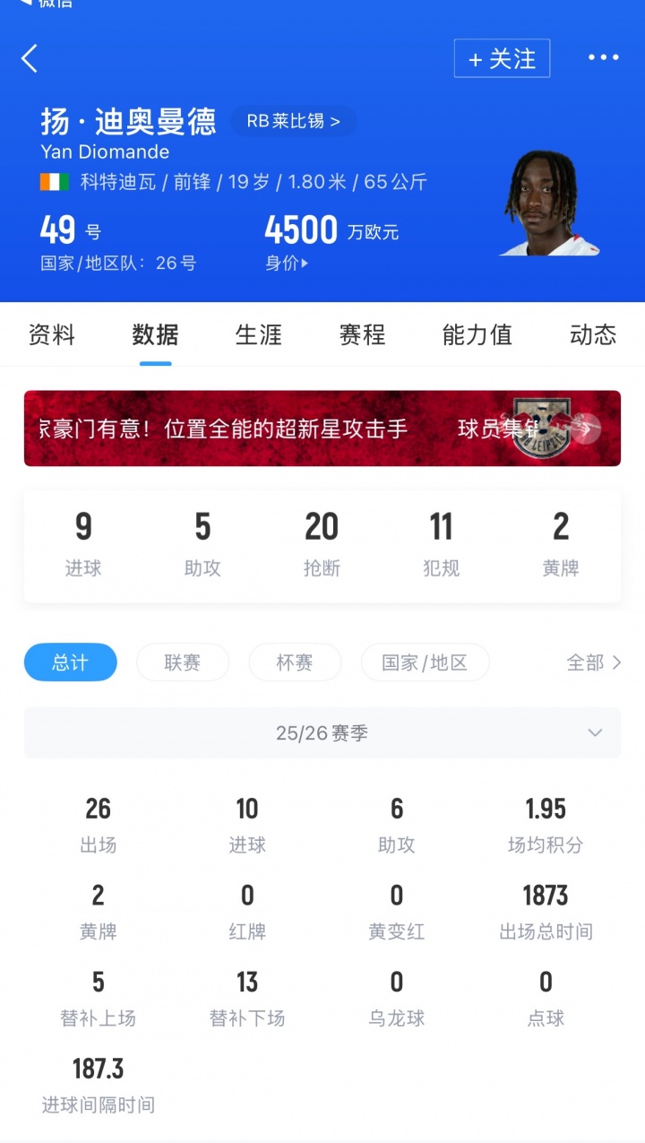 莱比锡去年夏窗花费2000万欧元,从莱加内斯签下迪奥曼德,本赛季这位19岁的前锋各赛事出场26次,贡献10球6助。