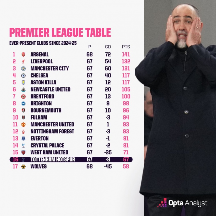 零点吧足球3月6日讯 据Opta统计,上赛季以来热刺在英超拿到67分,近两个赛季都在英超的球队之中,热刺的积分仅多于狼队(58分)。