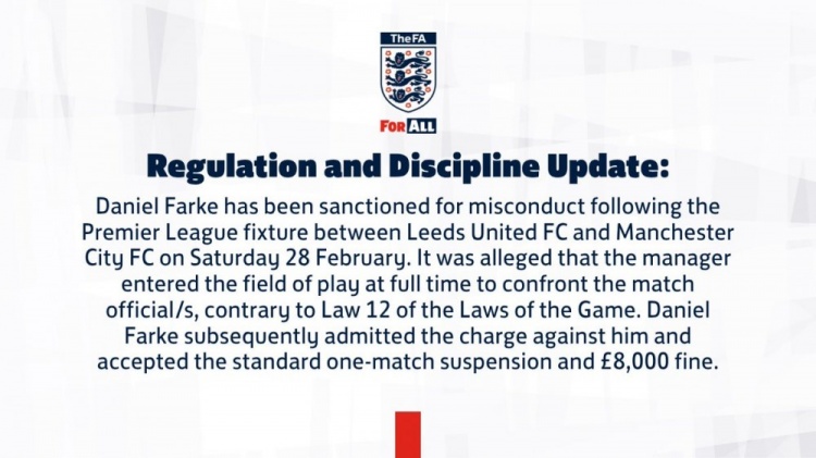 英足总发布公告:“丹尼尔·法尔克因在利兹联对阵曼城的比赛结束后存在不当行为而受到处罚。据指控,该主教练在全场结束时进入比赛场地与裁判发生对峙,此举违反了《足球竞赛规则》第12条。丹尼尔·法尔克承认该项指控,并接受标准的一场停赛处罚,以及8000英镑罚款。”