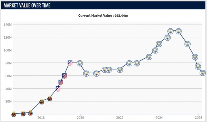 罗德里如今的身价只有1年多之前的一半,遭遇四连降。