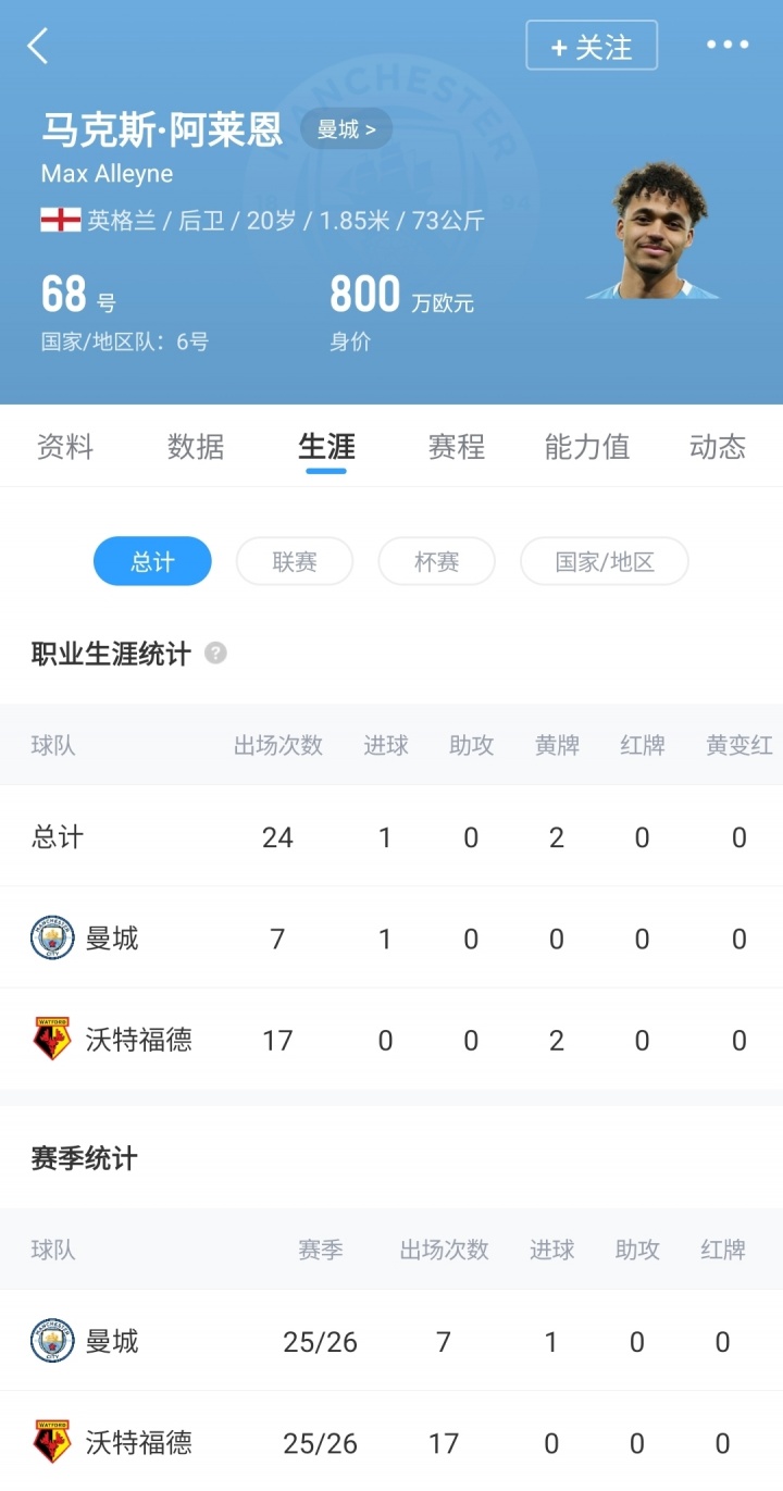 零点吧足球03月10日讯 近日德转更新英超球员身价,20岁曼城中卫阿莱恩身价暴涨900%,从80万欧涨至800万欧。