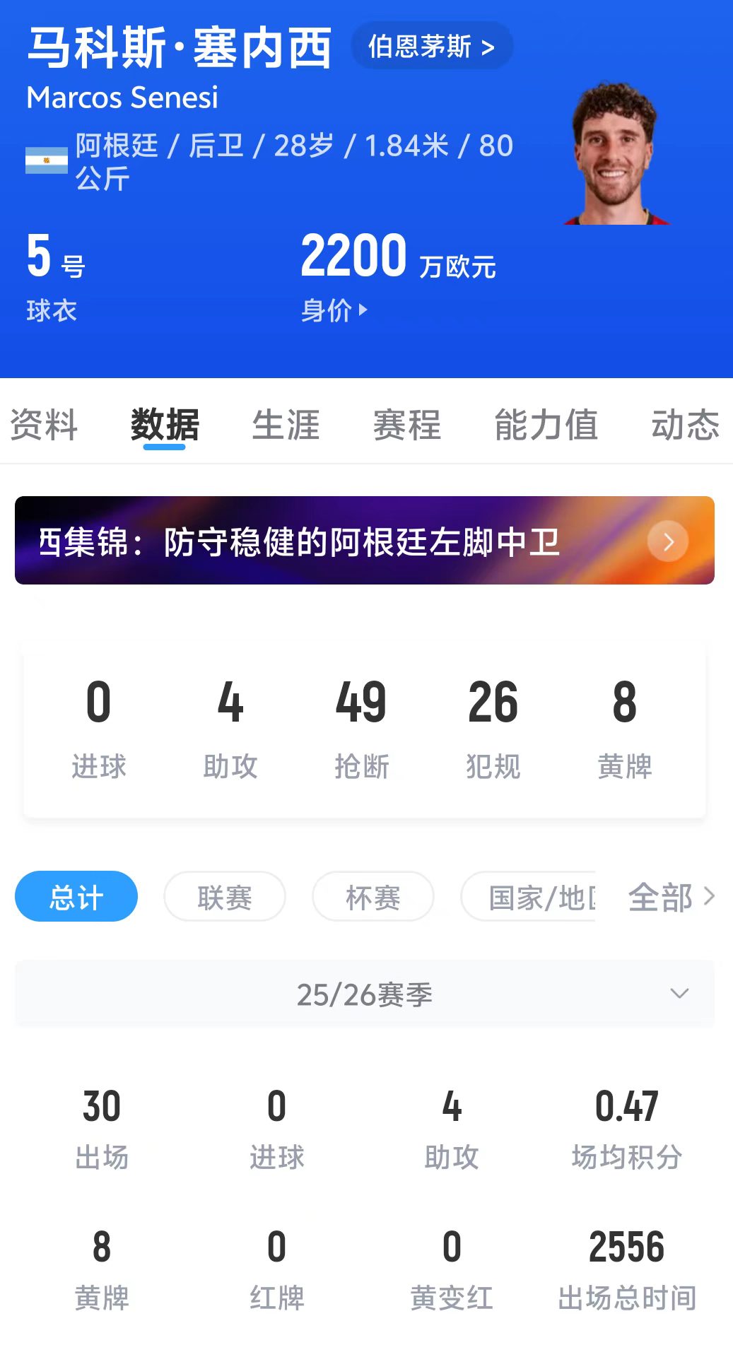 塞内西现年28岁,为伯恩茅斯出场30次,贡献4次助攻和49次抢断。目前身价2200万欧元,他与伯恩茅斯的合同将在今年夏天到期。