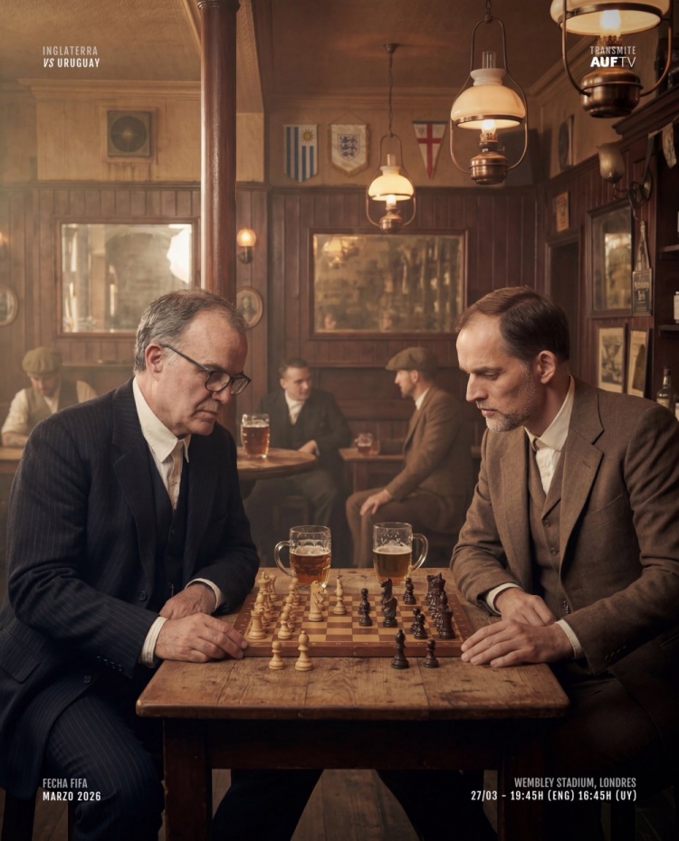 今日,乌拉圭官方晒出海报,为本场比赛预热。两队主帅贝尔萨与图赫尔在国际象棋中对弈,海报左上角为对阵双方,右下角为比赛场地以及开球时间信息。