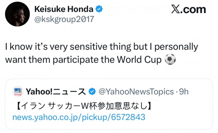 前日本国脚本田圭佑社媒:虽然很敏感,但希望伊朗能参加世界杯