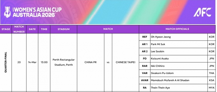 亚足联公布本场比赛裁判名单。韩国裁判员吴贤贞担任本场比赛主裁判,助理裁判也来自韩国,分别为朴美淑、李秀彬。VAR裁判是来自泰国的普乌东。