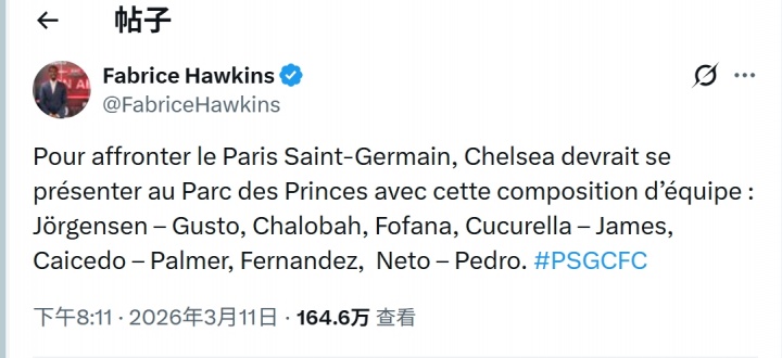 法国记者北京时间昨晚8点11分泄露切尔西首发