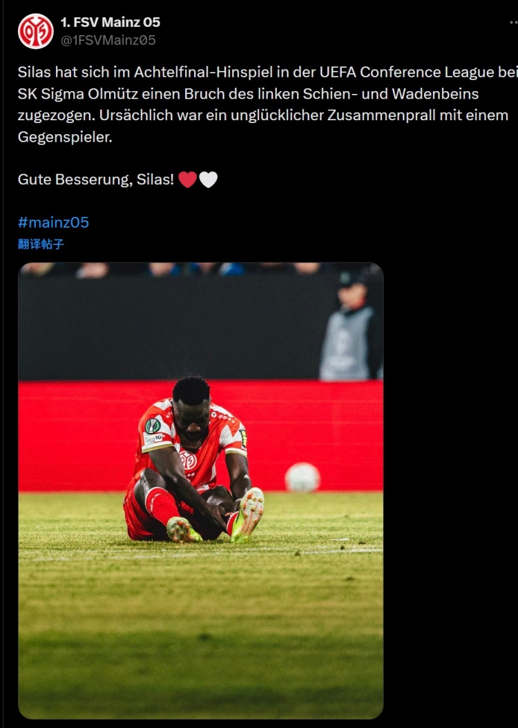 西拉斯在美因茨对阵奥洛莫茨的欧协联1/8决赛首回合比赛中受伤,美因茨官方发布公告,确认球员左胫骨和腓骨骨折。