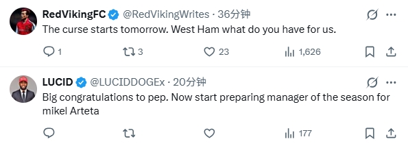 “热烈祝贺佩普得奖,现在轮到给阿尔特塔准备赛季最佳主教练奖了。”