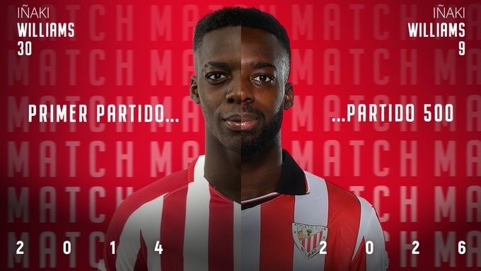 零点吧足球3月14日讯 毕尔巴鄂竞技官推发文,球队青训前锋伊纳基·威廉姆斯迎来其毕巴生涯500场里程碑。