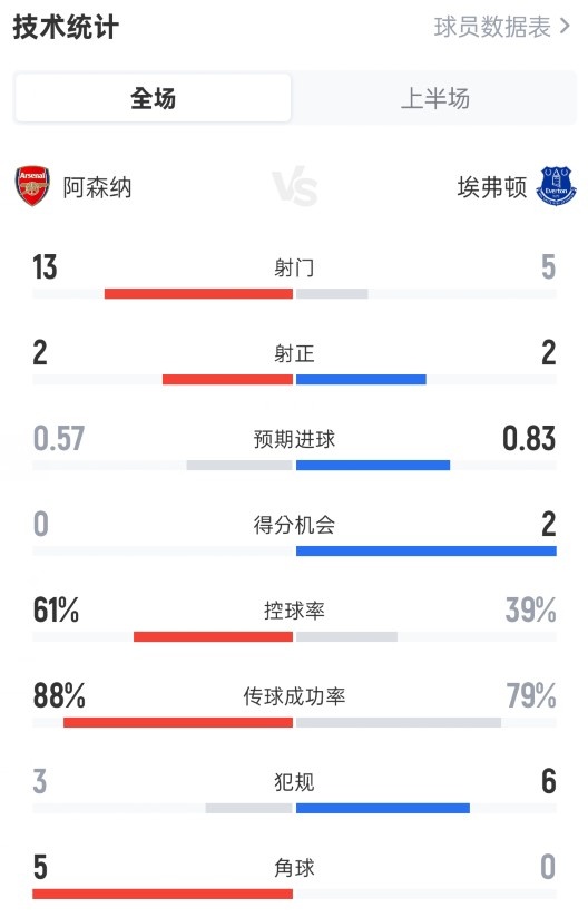 阿森纳半场0-0埃弗顿数据:射门13-5,射正2-2,控球率61%-39%