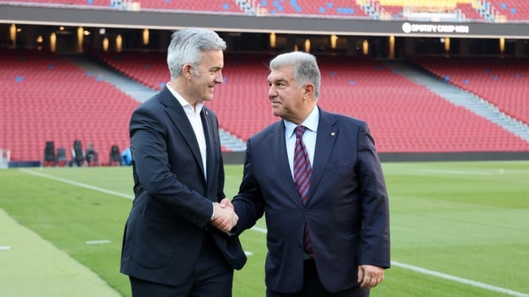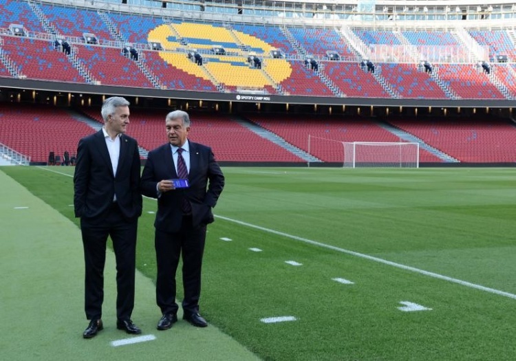 拉波尔塔和丰特友好且积极配合地回应了《世界体育报》的拍摄提议,他们先是像职业球员一样从新建的球员通道走出,呼吸着这座标志性体育场的独特氛围。然后在一个位于球场中央的投票箱前投票,表情显示出默契和幽默。最后,在也对着镜头做了几次射门、捕捉到他们最贴近球迷和巴萨一面的姿态后,他们卷起袖子,争抢着顶一个红蓝色的球。