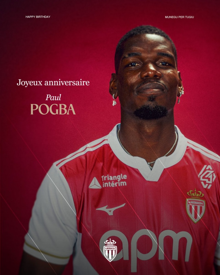 摩纳哥官方社媒晒出博格巴的生日海报,配文:“博格巴今天迎来了他的33岁生日,祝你生日快乐!”