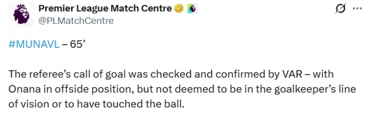 裁判判定进球有效,该判罚经VAR回放核实并确认——阿马杜·奥纳纳处于越位位置,但并未被认定阻挡门将视线或触碰到皮球。
