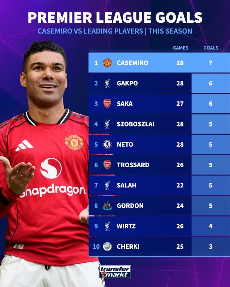 卡塞米罗本赛季英超打进7球,多于萨卡、萨拉赫、维尔茨等球员