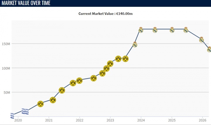 此前贝林厄姆德转巅峰身价为1.8亿欧元,但德转本赛季两次更新,球员身价均有下降。本赛季贝林厄姆受到伤病困扰,各赛事目前出场28次,贡献6球4助。