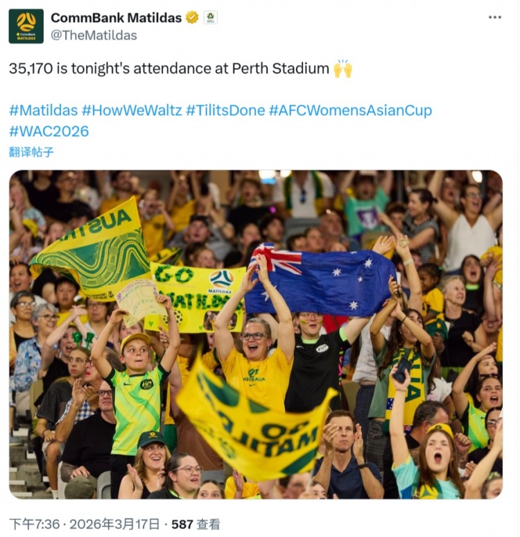 零点吧足球3月17日讯 根据澳大利亚女足官方数据,女足亚洲杯首场半决赛观众人数为35170人。