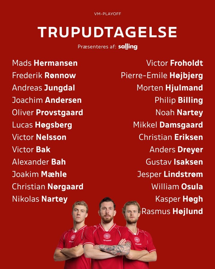 后卫:安诺森(富勒姆)、普罗夫斯加德(拉齐奥)、霍斯贝里(斯特拉斯堡)、维克托·尼尔森(维罗纳)、维克托·巴克(中日德兰)、亚历山大·巴(本菲卡)、梅勒(沃尔夫斯堡)
