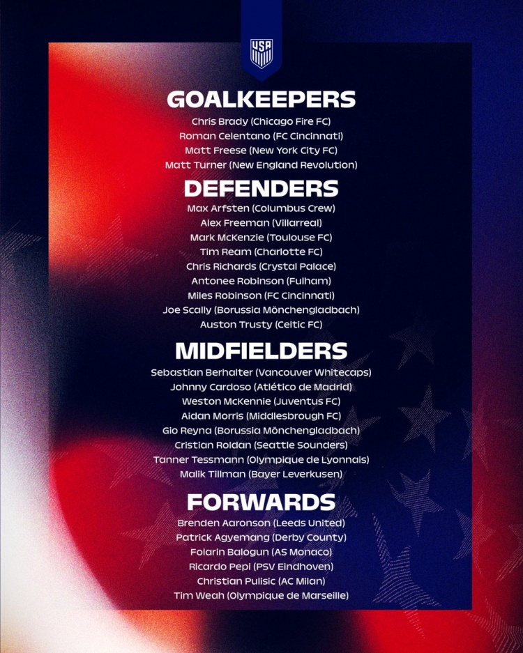 零点吧足球3月17日讯 美国队最新一期名单公布,普利西奇、麦肯尼、巴洛贡、蒂莫西·维阿、卡尔多索等球员入选。