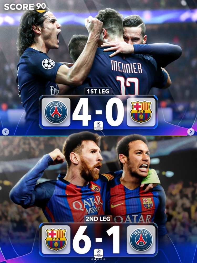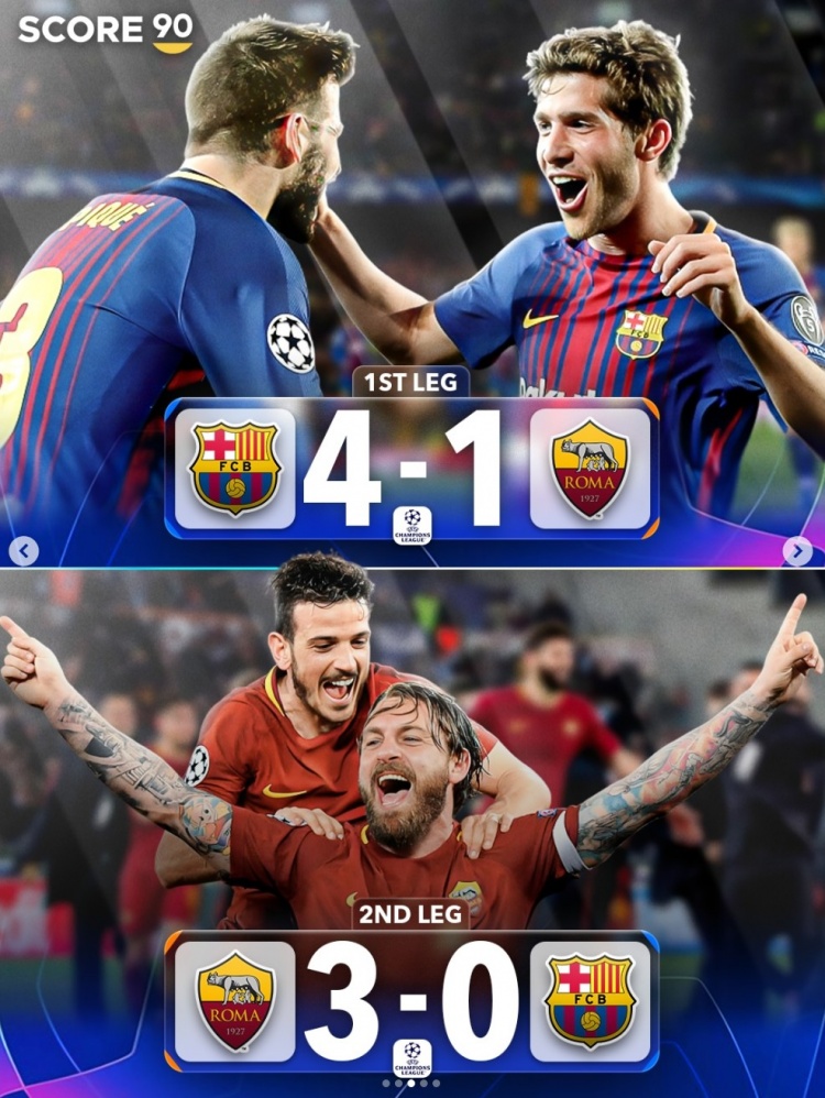 据score90统计,在欧冠历史上,仅出现过4次球队在首回合落后3球的情况下,次回合逆转取胜。