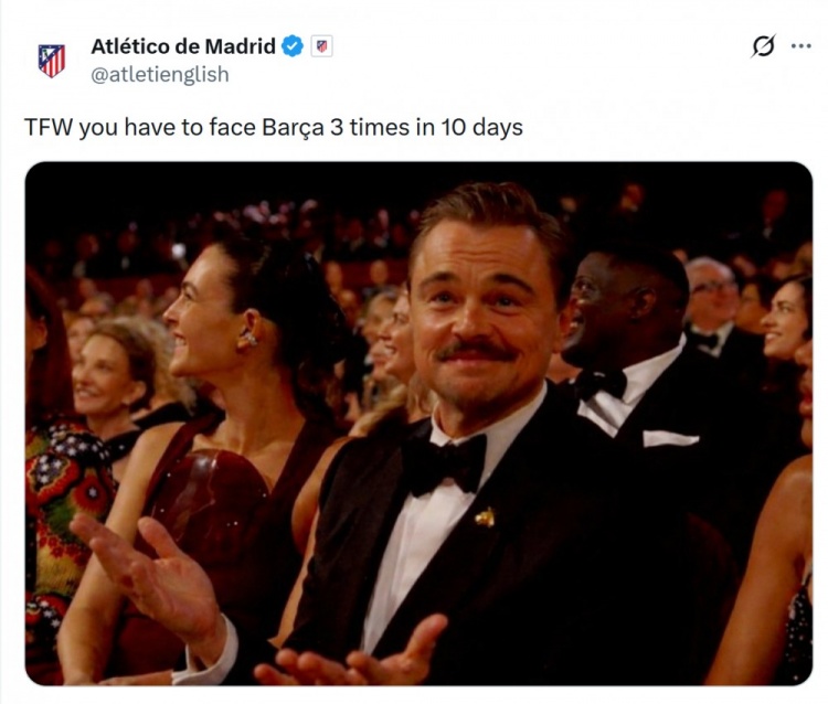 这意味着马竞将在10天内3次对阵巴萨,马竞官方社媒晒出莱昂纳多·迪卡普里奥在奥斯卡颁奖典礼上一脸无奈的照片,配文:“当你不得不在10天内3次对阵巴萨的感受。”