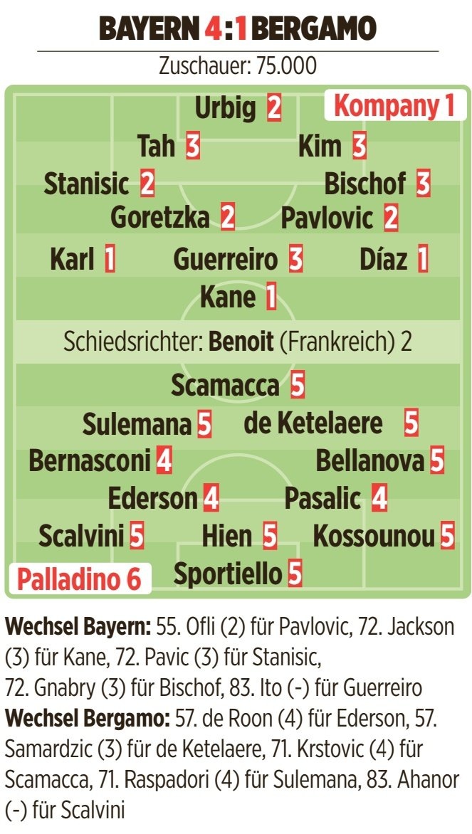 拜仁vs亚特兰大图片报评分:凯恩、卡尔、迪亚斯、孔帕尼1分最高
