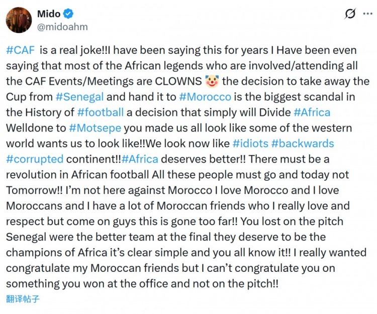 零点吧足球3月19日讯 前埃及国脚米多更新社媒动态,谈到了非洲足联剥夺塞内加尔非洲杯冠军的话题。
