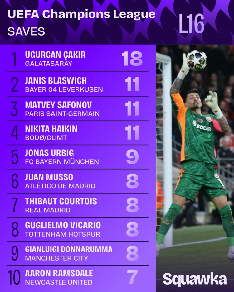 据Squawka统计,加拉塔萨雷门将恰基尔对阵利物浦两回合做出18次扑救,包括扑出萨拉赫的点球,本届1/8决赛扑救次数最多。恰基尔次回合比赛做出11次扑救,近10个赛季欧冠淘汰赛单场扑救次数最多。