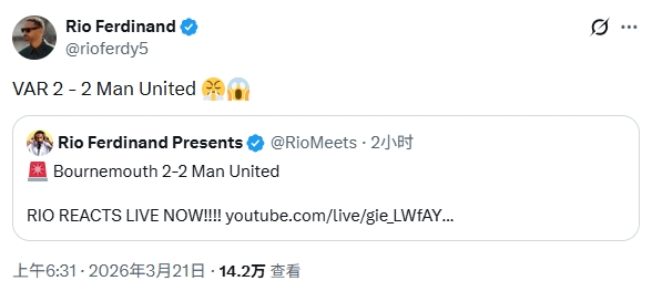 零点吧足球03月21日讯 英超第31轮,10人曼联客场2-2战平伯恩茅斯,本场比赛的判罚引发争议。赛后,费迪南德愤怒发文:“VAR 2-2 曼联????”。