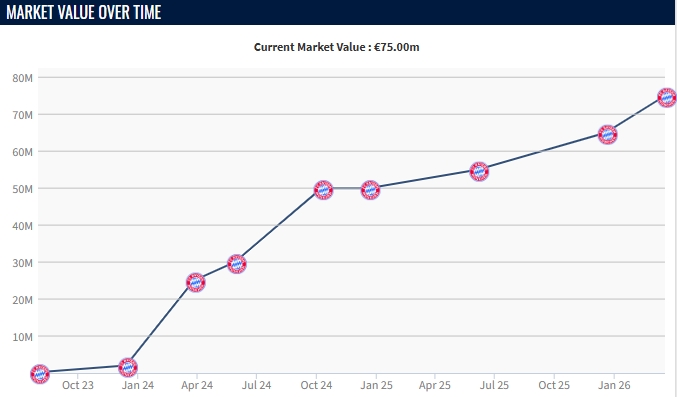 帕夫洛维奇本赛季坐稳了拜仁主力后腰的位置,身价也是两度上涨1000万欧,从5500万达到7500万,目前在同龄球员中仅次于若昂·内维斯。
