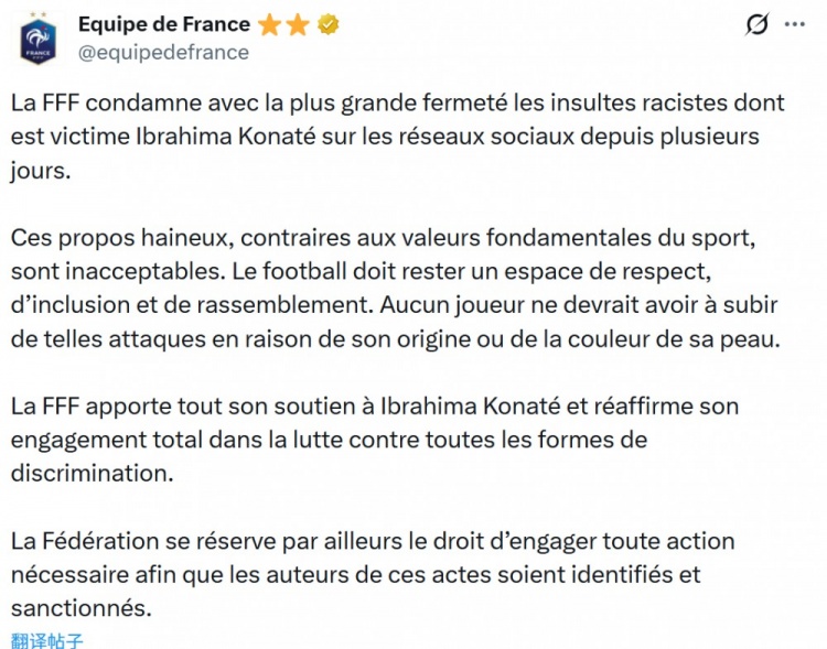 法国足协官方谴责歧视科纳特的行为:“法国足协对科纳特近日在社交媒体上遭受的种族主义侮辱表示最严厉的谴责。这些充满仇恨的言论违背了体育的基本价值观,是绝对不可接受的。足球必须始终是一个充满尊重、包容与团结的领域,任何球员都不应因其出身或肤色而遭受此类攻击。