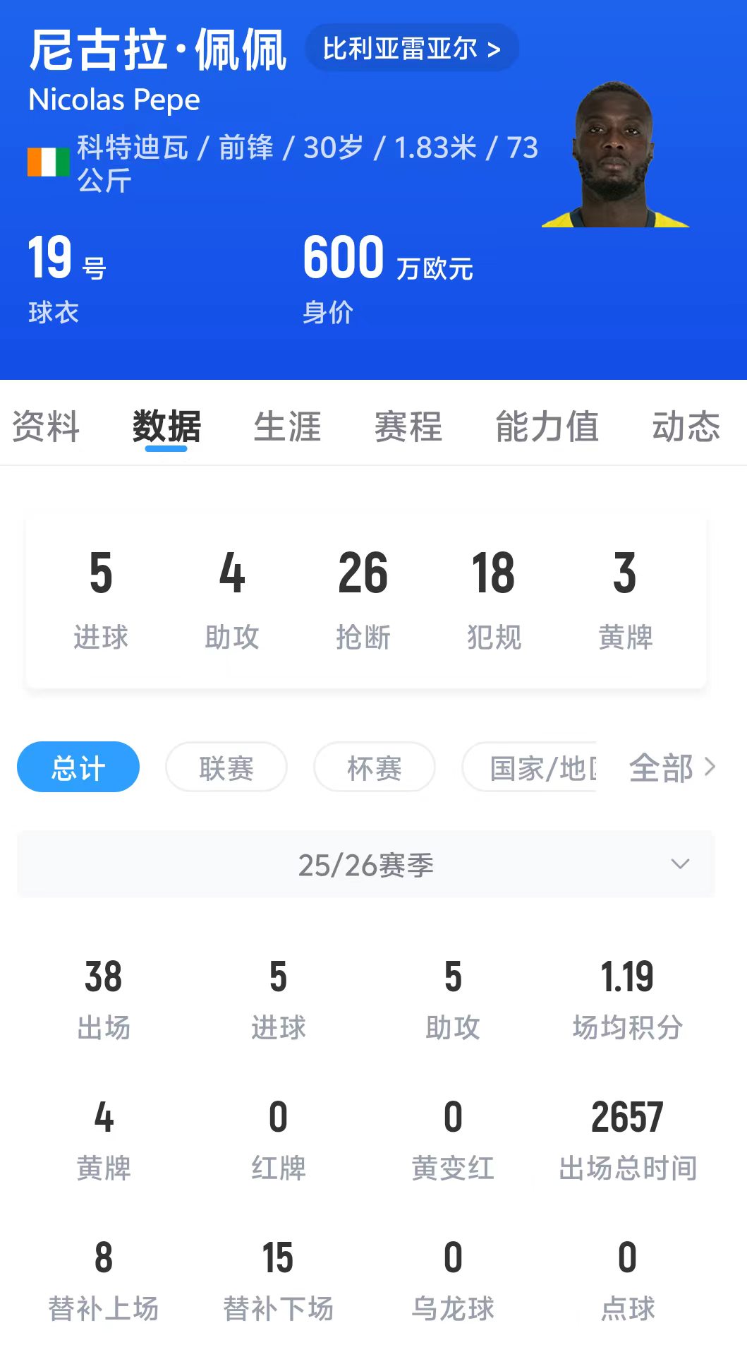 尼古拉·佩佩现年30岁,本赛季代表比利亚雷亚尔出场38次,贡献5球5助攻,当前身价600万欧。