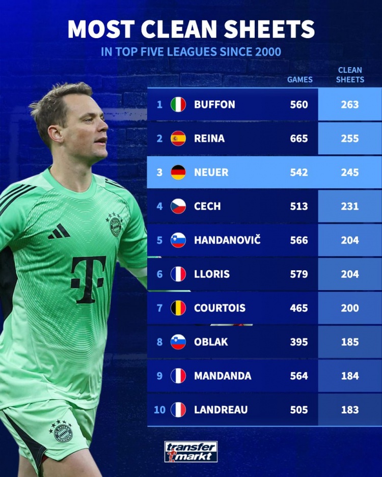 零点吧足球3月27日讯 德国转会市场统计了2000年以来五大联赛门将零封场次,并列出榜单,布冯263场居首,雷纳、诺伊尔排名二三位。