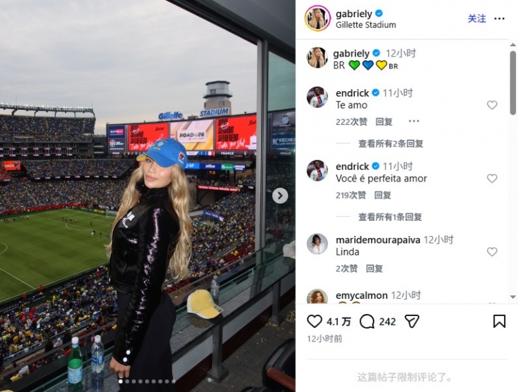 零点吧足球3月27日讯 恩德里克的妻子今天在Instagram晒出自己在现场观看巴西vs法国比赛的照片,恩德里克也在评论区现身互动。