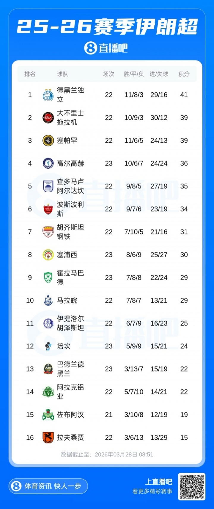 25/26赛季伊朗超于2月底停摆,当时进行到第23轮,德黑兰独立暂以2分优势领跑积分榜。