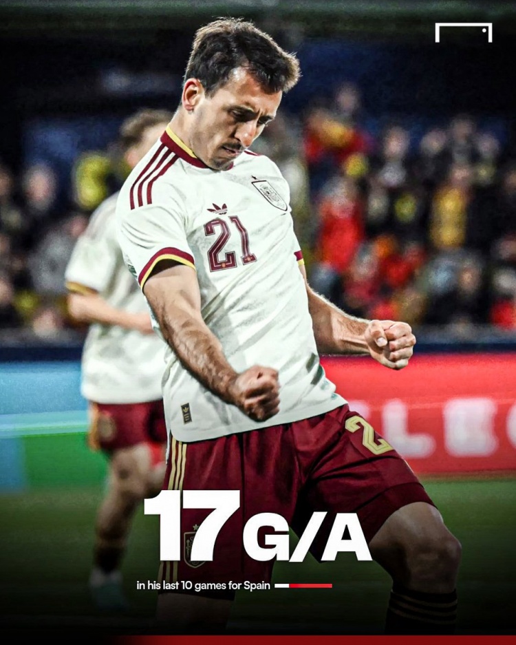 奥亚萨瓦尔近10次为西班牙队出战打进11球,助攻6次,总计参与17粒进球,包括这个国际比赛日对阵塞尔维亚的梅开二度。