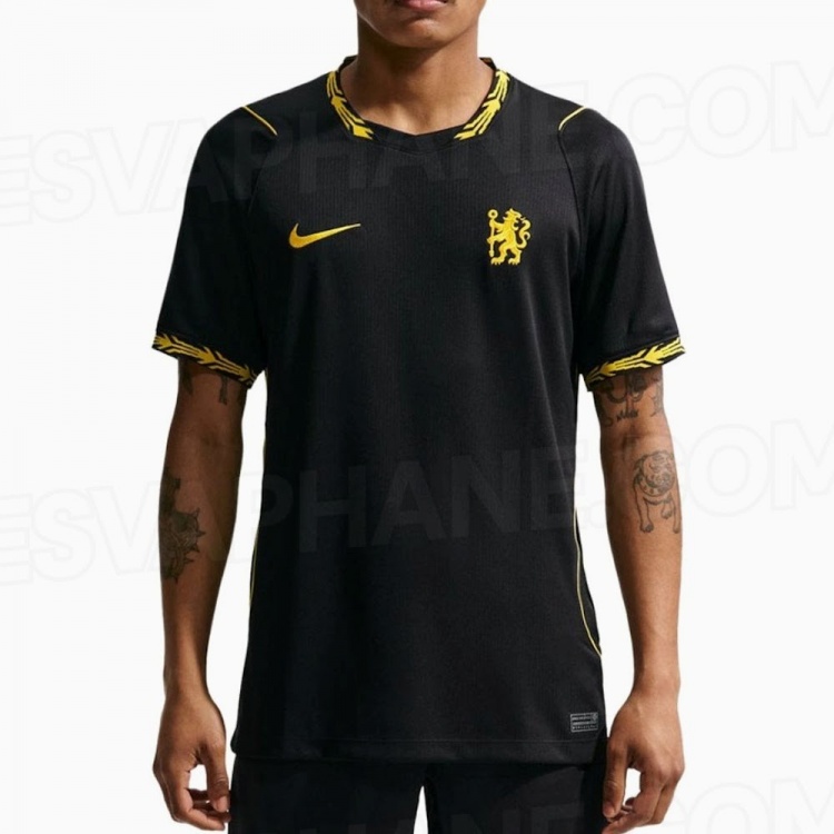 切尔西新赛季客场球衣谍照:简约黑色设计,衣领、袖口金色点缀