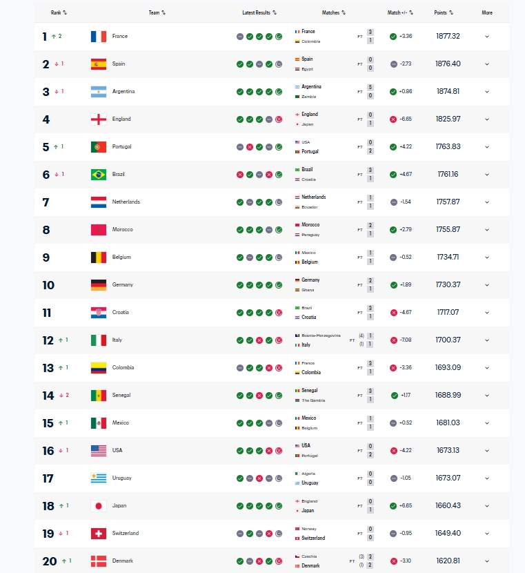 FIFA实时排名前20:
