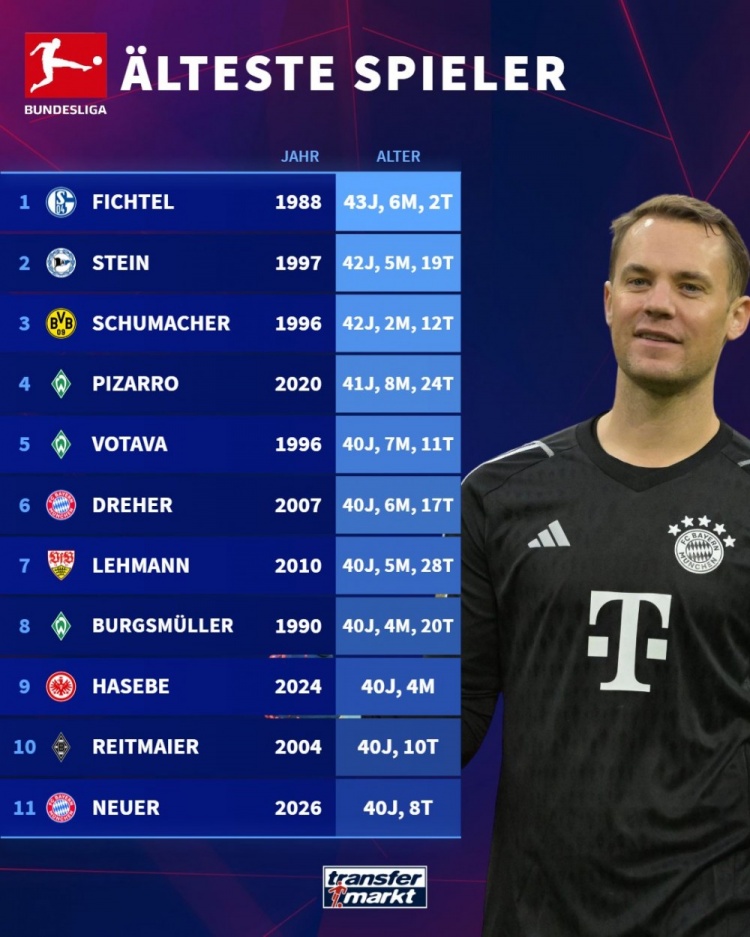 40岁零8天!诺伊尔成为德甲第11位40+岁出场球员